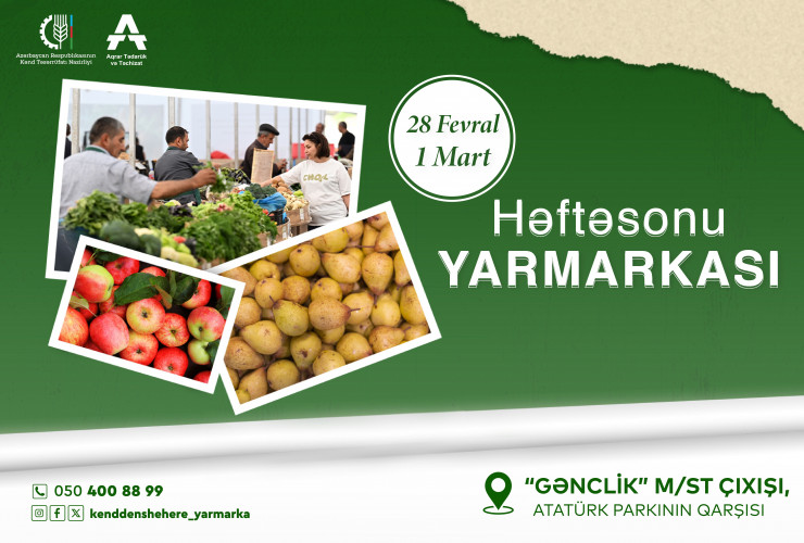 28 fevral-1 mart tarixlərində Kənd Təsərrüfatı Nazirliyinin tabeliyindəki “Aqrar Tədarük və Təchizat” ASC-nin təşkilatçılığı ilə paytaxtda “Kənddən Şəhərə” həftəsonu yarmarkası keçiriləcək.