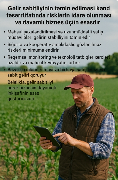 Sahibkartv.az xəbər verir ki, gəlir sabitliyinin təmin edilməsi kənd təsərrüfatında risklərin idarə olunması və davamlı biznes üçün əsasdır. Fermerlər məhsul planlaması, bazar analizləri və resursların səmərəli istifadəsi ilə bunu reallaşdırırlar.
