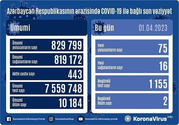 Azərbaycan Respublikasında koronavirus (COVID-19) infeksiyasına 75 yeni yoluxma faktı qeydə alınıb, 16 nəfər müalicə olunaraq sağalıb.
