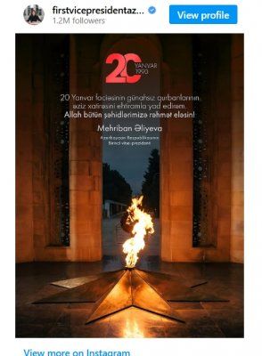 Azərbaycan Respublikasının Birinci vitse-prezidenti Mehriban Əliyeva sosial şəbəkə hesablarında 20 Yanvar faciəsinin 36-cı ildönümü ilə bağlı paylaşım edib.